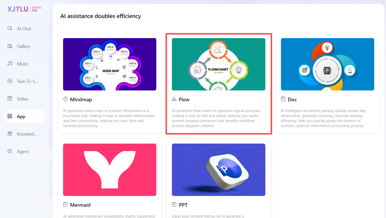 This guide explains how to use App on XIPU AI (https://xipuai.xjtlu.edu.cn/v3/index) to leverage three core AI-powered tools: Mindmap, Flow, and Doc. These tools help users visualize ideas, optimize workflows, and process documents efficiently through AI automation.