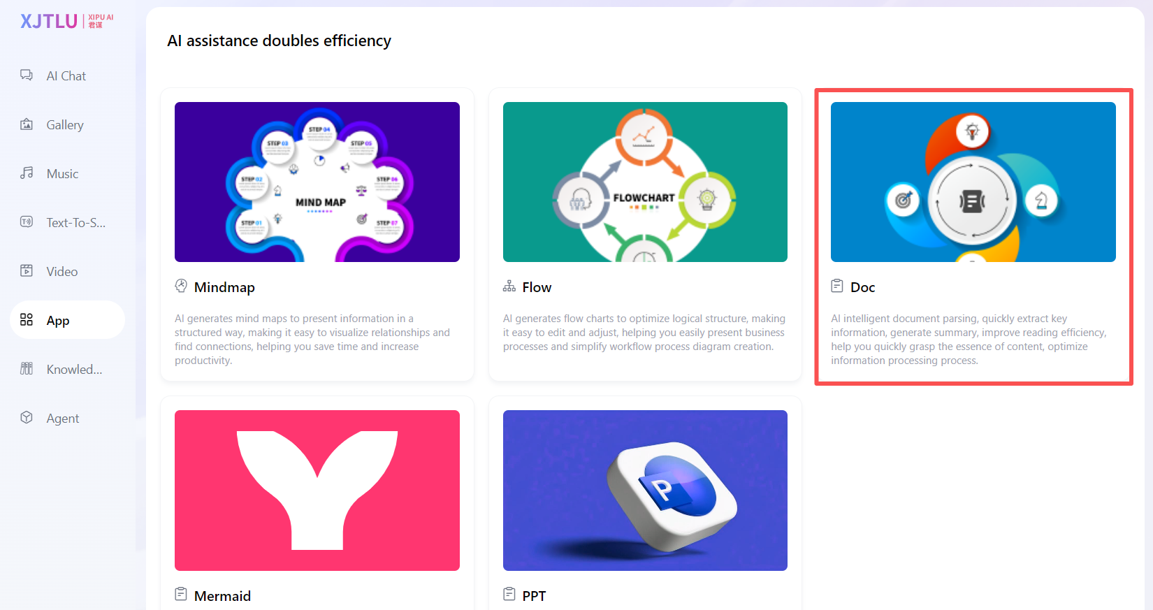 This guide explains how to use App on XIPU AI (https://xipuai.xjtlu.edu.cn/v3/index) to leverage three core AI-powered tools: Mindmap, Flow, and Doc. These tools help users visualize ideas, optimize workflows, and process documents efficiently through AI automation.