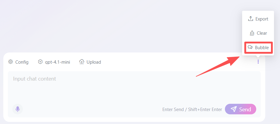 Toggle between Bubble (conversational layout) or List (structured view) for chat display.